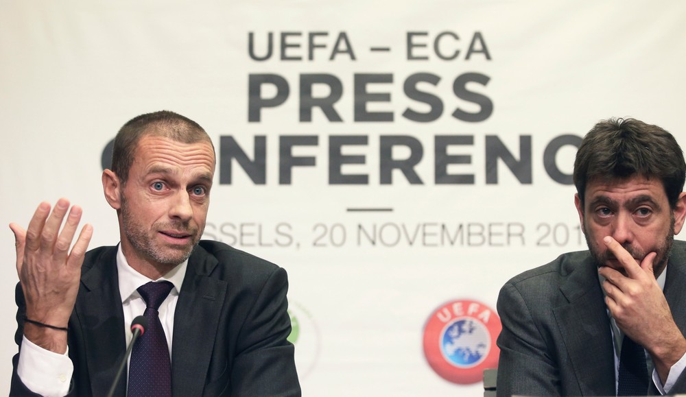 Aleksander Ceferin, presidente da Uefa, e Andrea Agnelli, presidente da ECA, em entrevista coletiva em novembro passado: impasse — Foto: REUTERS/Francois Walschaerts