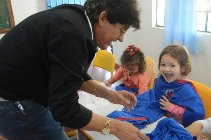 Imagens do prefeito Valdomiro entregando kits escolares e uniformes para os alunos do cei Guaicuru