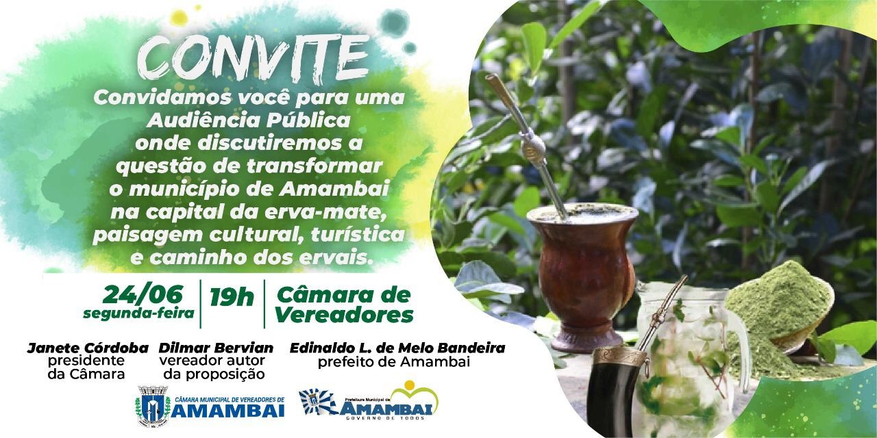 A Câmara Municipal de Amambai realiza nesta segunda-feira, 24 de junho, uma Audiência Pública para discutir a questão de transformar o município de Amambai na capital da Erva-Mate: paisagem cultural, turística e caminho dos ervais. A programação acontece a partir das 19 horas no Plenário Lourino de Jesus Albuquerque.