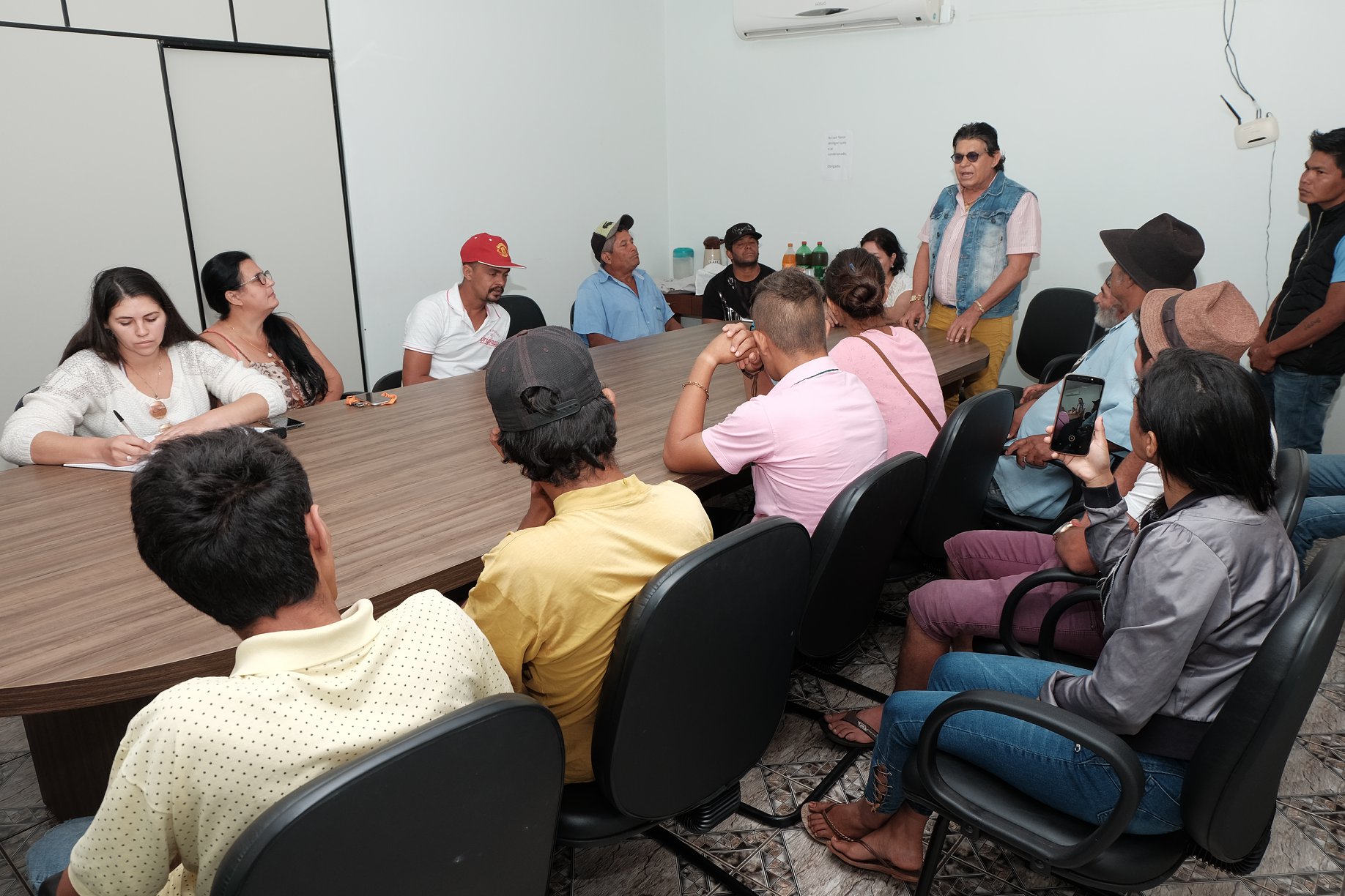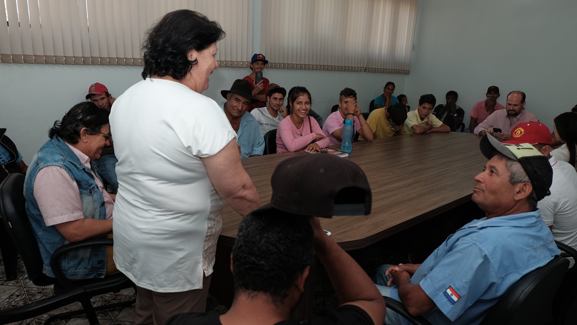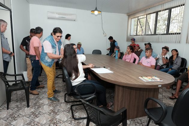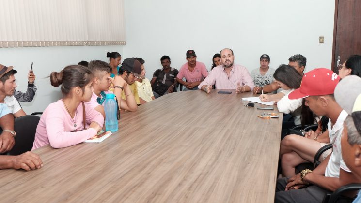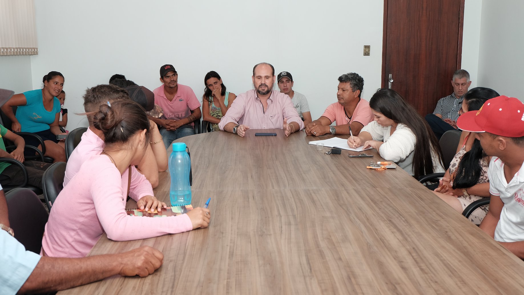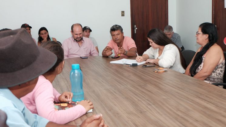#PraCegoVer – Imagens dos habitantes do residencial dentro da sala de reuniões juntamente do prefeito Valdomiro, vice prefeita Rosaria, Doutor Carlos Rogério (Jurídico) e César da Mata (coordenadoria de Habitação). E foto posada com os habitantes em frente a prefeitura