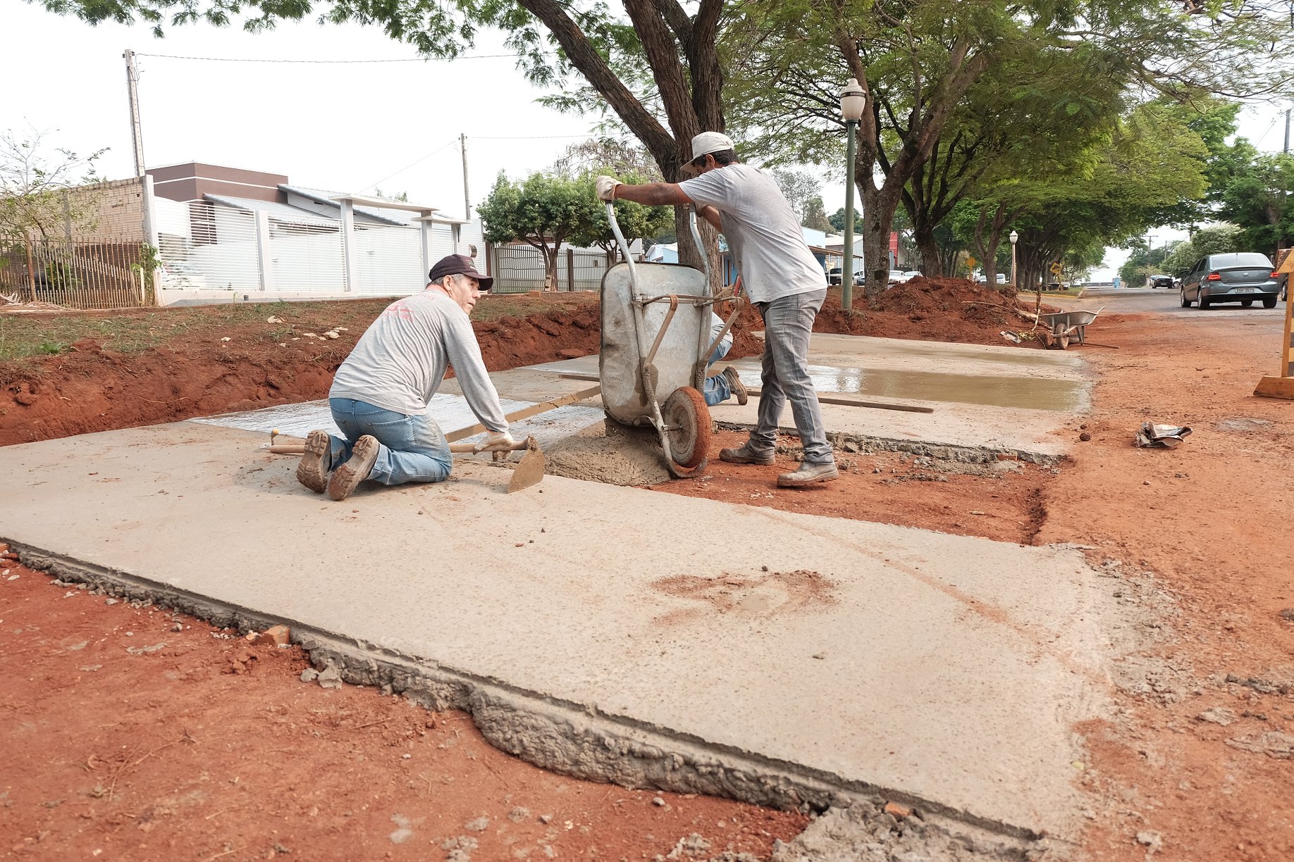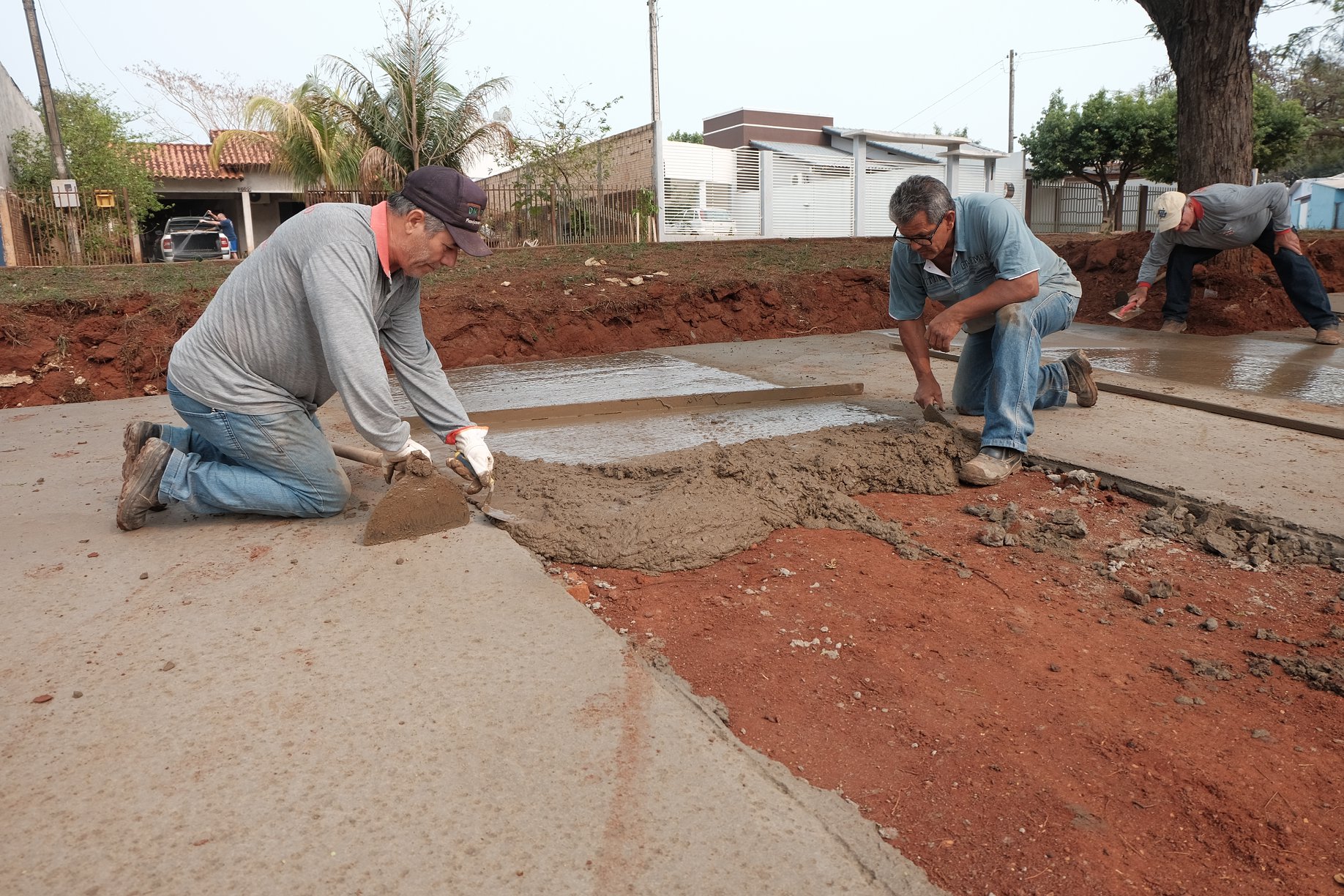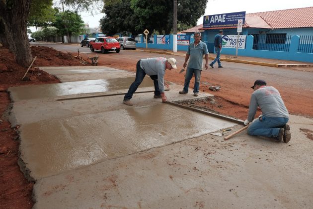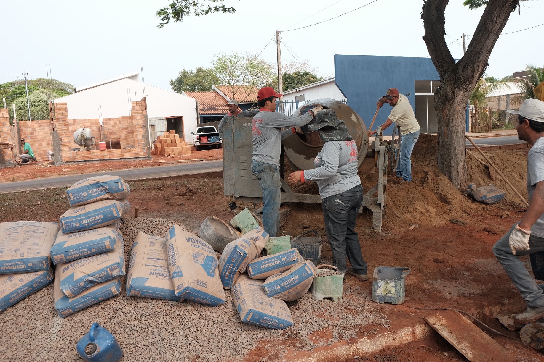 #PraCegoVer – Imagens dos servidores jogando e assentando o cimento no chão na finalização do estacionamento