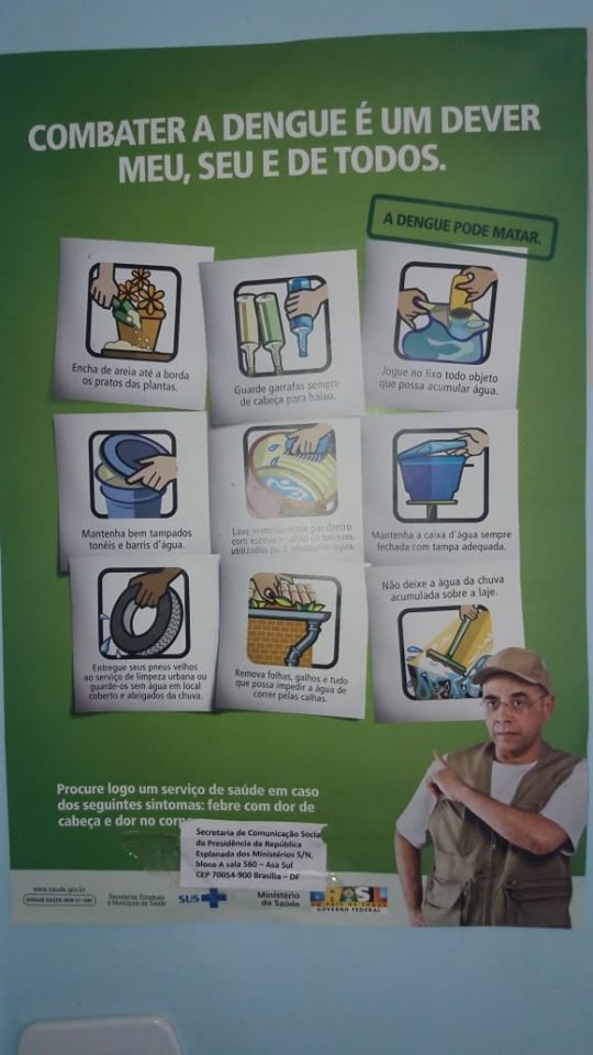 #PraCegover – Imagens de divulgação de combate a dengue e outras doenças; e imagens de parte da equipe da Endemias, com o coordenador Adair a frente.