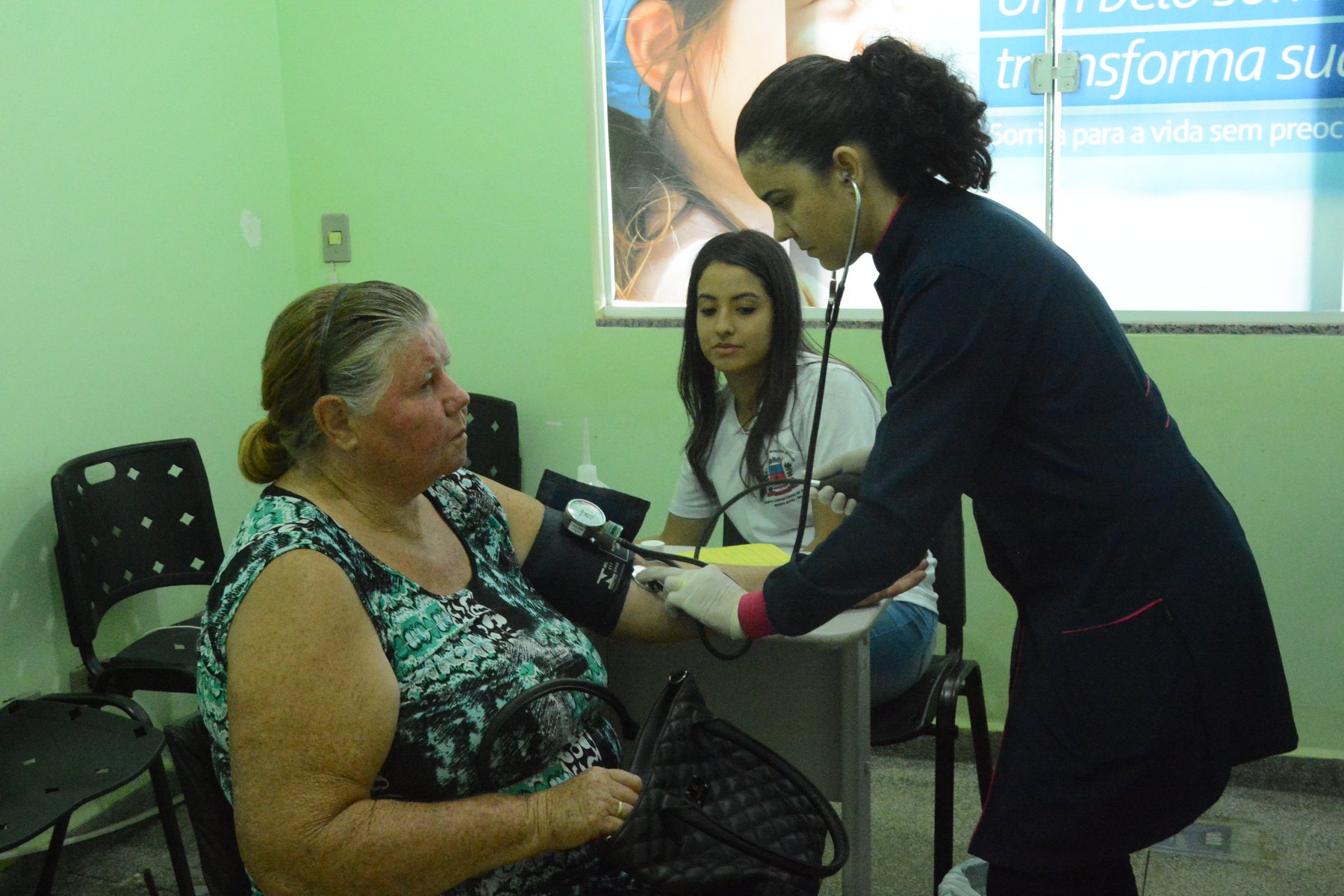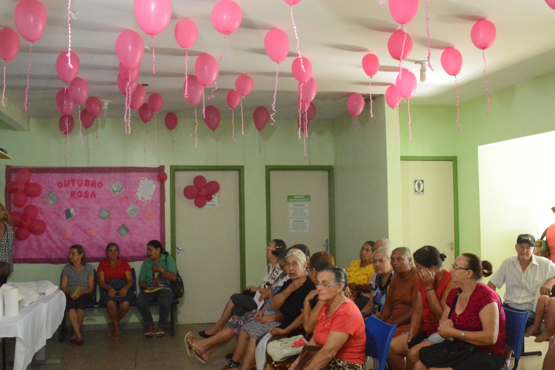 #PraCegoVer – Imagens das enfermeiras aferindo pressão nos pacientes, e os mesmos aguardando serem atendidos com posto de saúde decorado de balões rosas