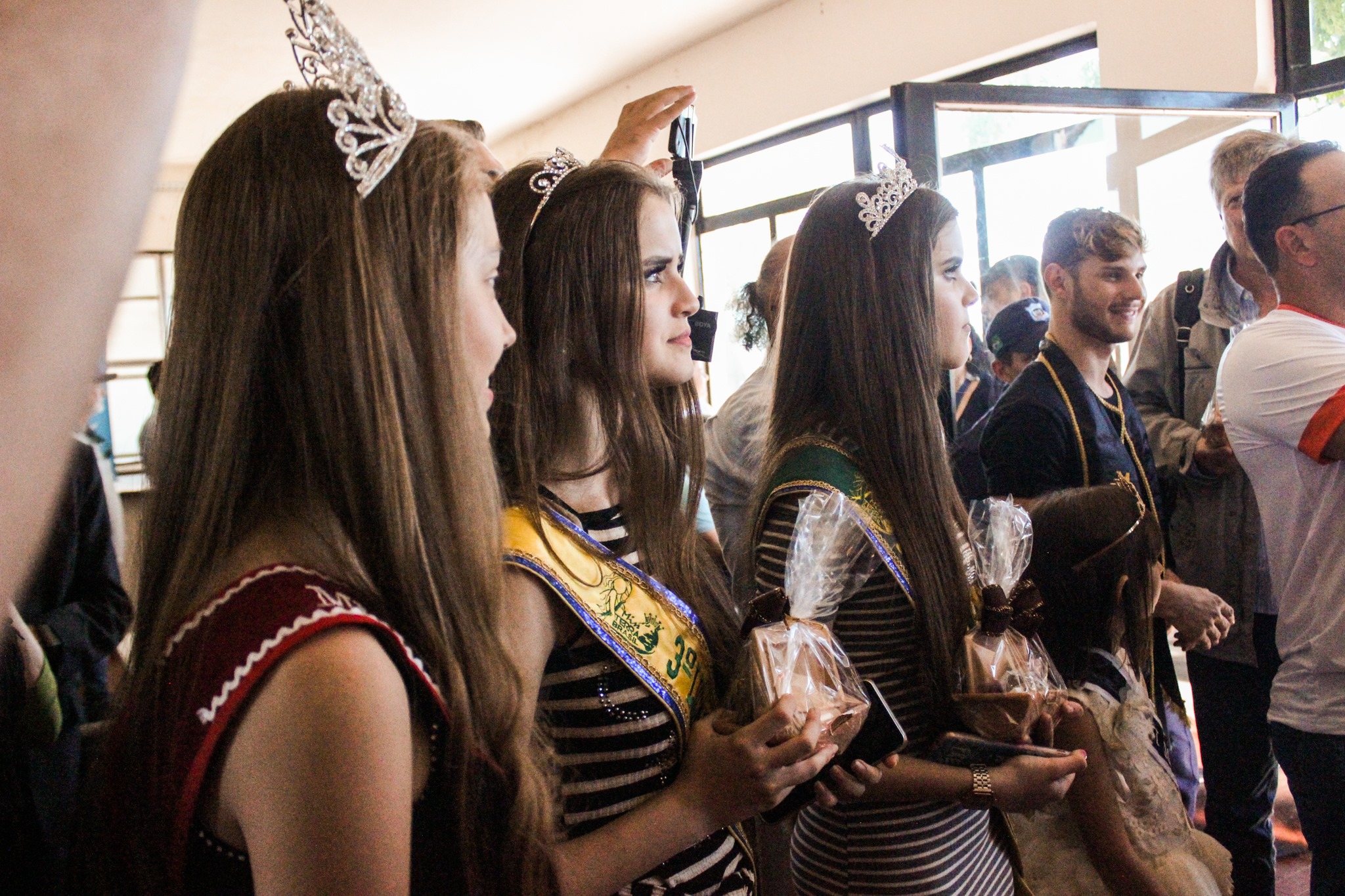 Os primeiros passageiros, piloto e copiloto receberam uma lembrança do Município das mãos das representantes da beleza Guairense.