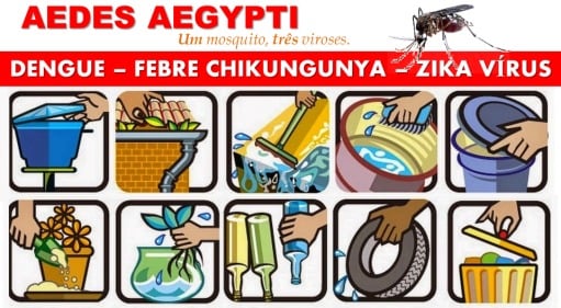 #PraCegoVer – Imagem com várias indicações de como combater a dengue a proliferação do mosquito, com instruções como: virar garrafas de cabeça para baixo; não deixar pneu em local impróprio, colocar areia em vasos de plantas…