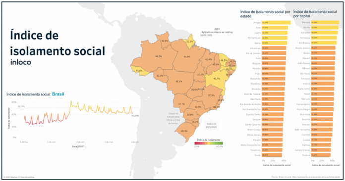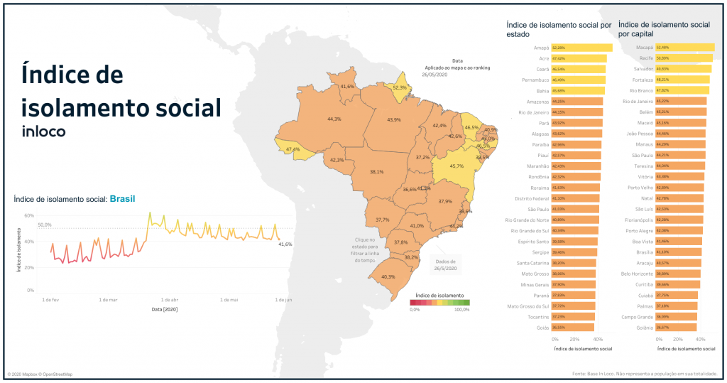 As taxas de isolamento social mapeadas pela In Loco nesta terça-feira (26.5) deixam o Estado no terceiro pior lugar do ranking das unidades da federação com índice de 37,7%. A novidade do monitoramento é o ranking das Capitais brasileiras. Com taxa de 36,9% para este dia, Campo Grande ficou em penúltimo lugar.