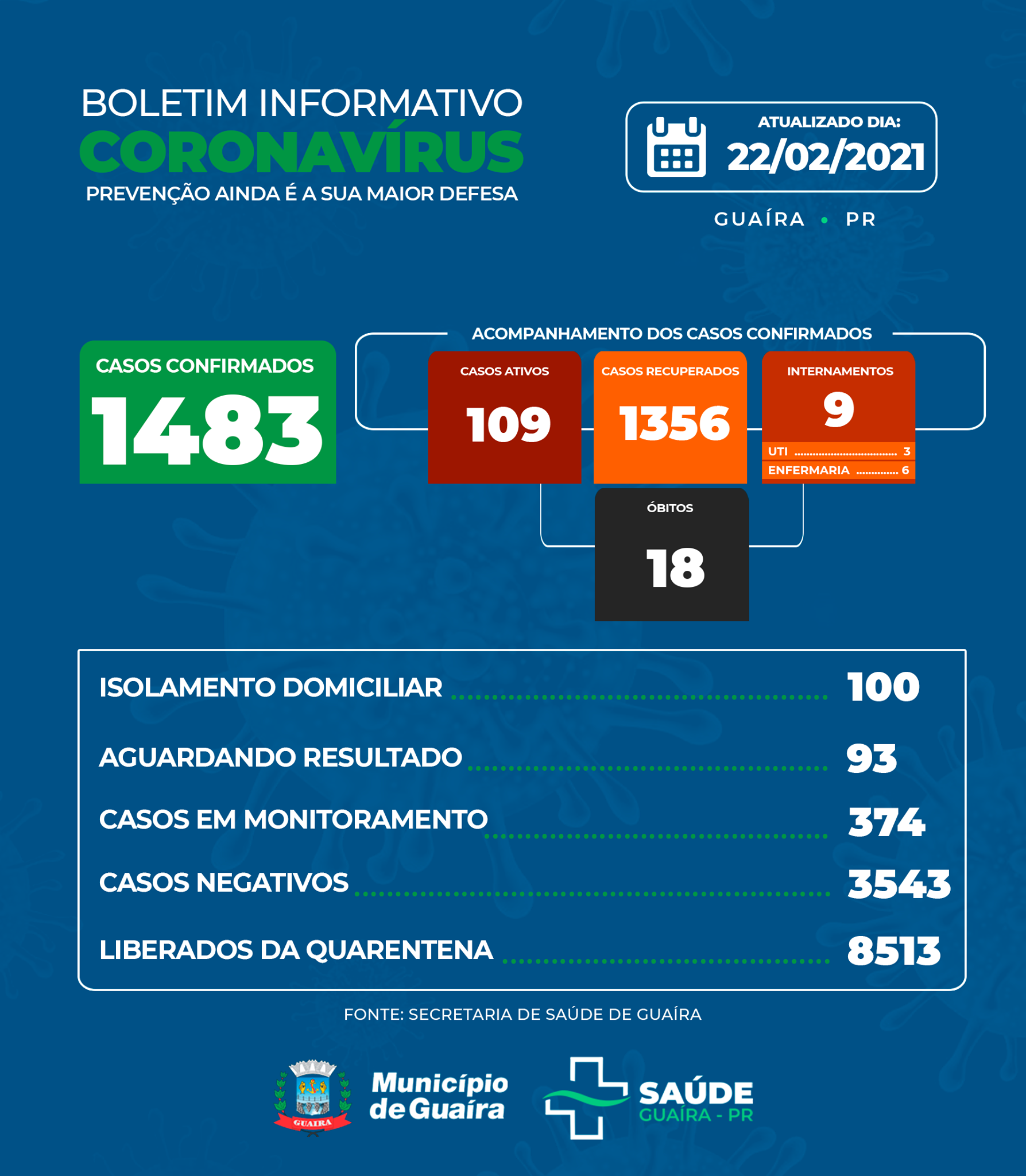 A Secretaria de Saúde, por meio da Vigilância Sanitária, informou hoje, segunda-feira,22 de fevereiro de 2021, mais 6 casos recuperados e liberados do isolamento.