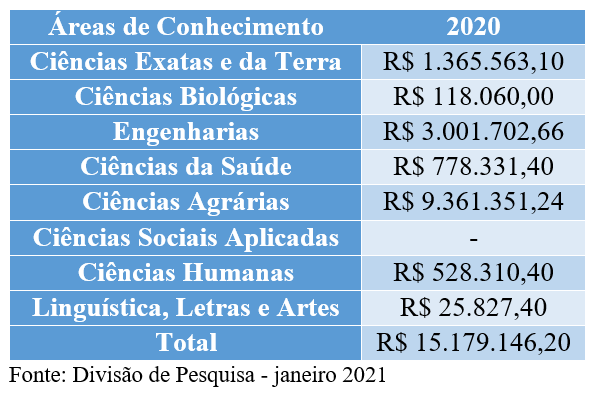 A quantidade de Bolsas de Produtividade em Pesquisa do CNPq também cresceu em 2020, passou de seis em 2019 para 9 em 2020 (das áreas de Ciências Exatas e da Terra – 4; Ciências Biológicas – 2; Ciências da Saúde – 1; Ciências Agrárias – 2). Essas Bolsas visam selecionar pesquisadores que possuam produção científica, tecnológica e de inovação de destaque em suas respectivas áreas do conhecimento.