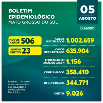 Em 24 horas Mato Grosso do Sul registrou 506 novos casos de covid-19 em 24 horas e 23 mortes, segundo os dados da Secretaria de Estado de Saúde (SES), nesta quinta-feira (5).