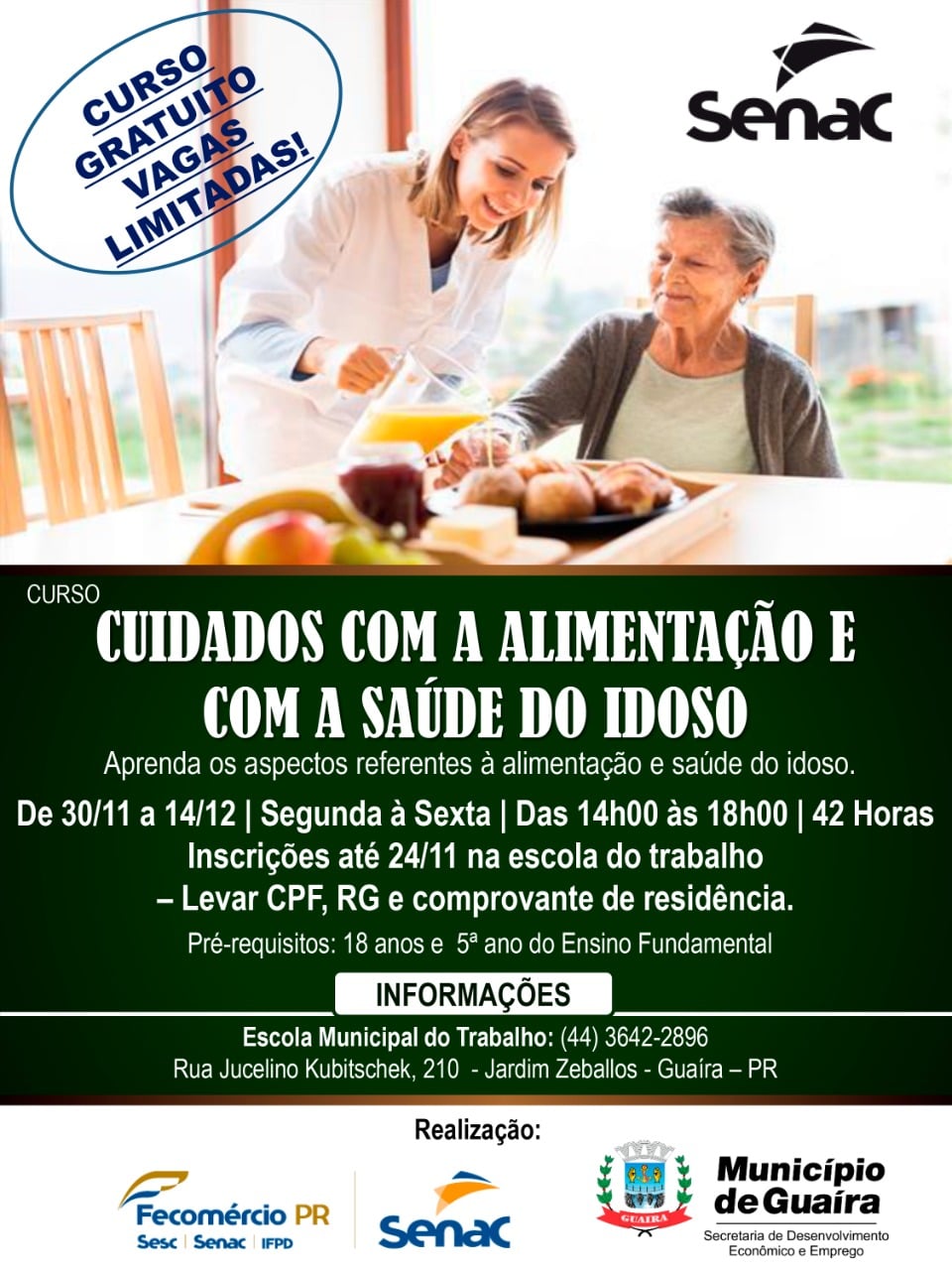 O Município de Guaíra, por meio da Escola Técnica Profissionalizante, da Secretaria de Desenvolvimento Econômico e Emprego, oferta mais uma oportunidade de qualificação profissional, o curso CUIDADOS COM A ALIMENTAÇÃO E COM A SAÚDE DO IDOSO, promovido em parceria com o Senac — Serviço Nacional de Aprendizagem Comercial.