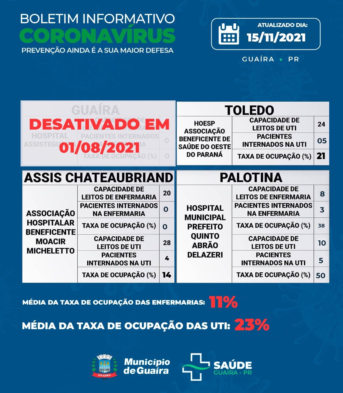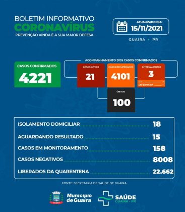 A Secretaria de Saúde, por meio da Vigilância Sanitária, informa nesta segunda-feira, 15 de novembro de 2021, mais 3 casos recuperados e liberados do isolamento.