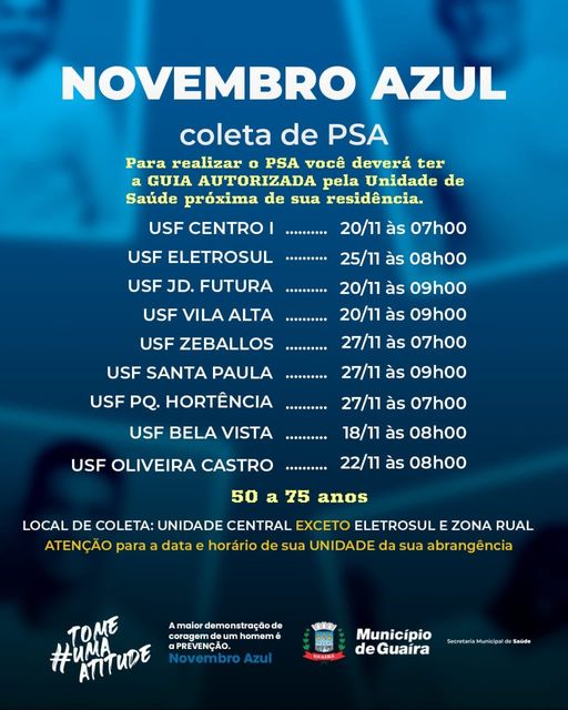 A Secretaria de saúdem neste mês de novembro, está trabalhando horários especiais para atendimento aos homens. A ação faz parte da Campanha, Novembro Azul, que ressalta a importância da detecção precoce do câncer de próstata.