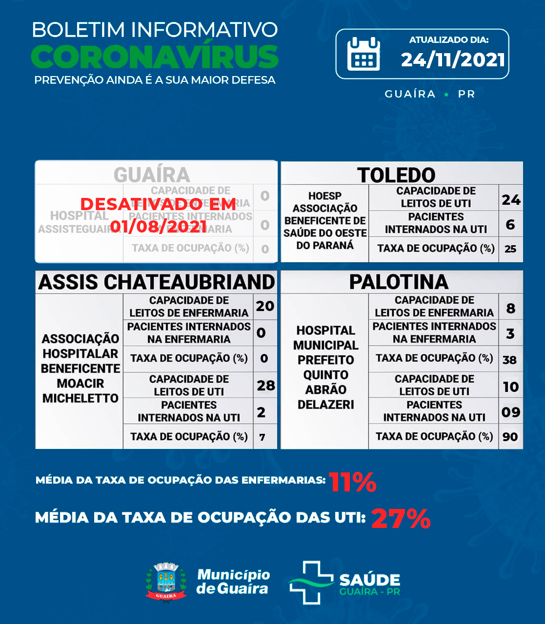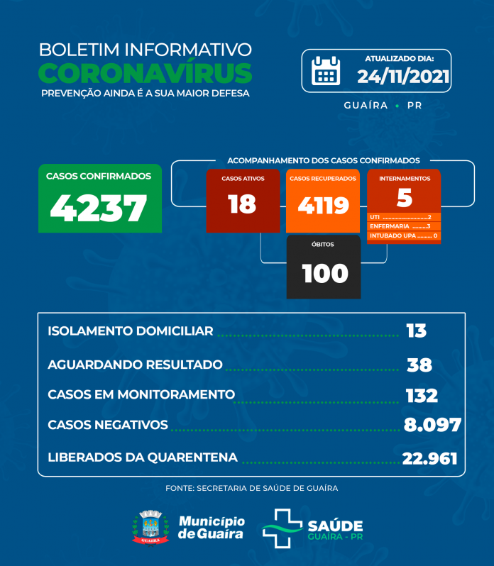 A Secretaria de Saúde, por meio da Vigilância Sanitária, informou nesta quarta-feira, 24 de novembro de 2021, mais 3 casos positivos. Dos 18 casos positivos ativos, 13 pacientes estão se recuperando em casa, 3 estão internados em enfermaria, 2 estão internados em UTI.
