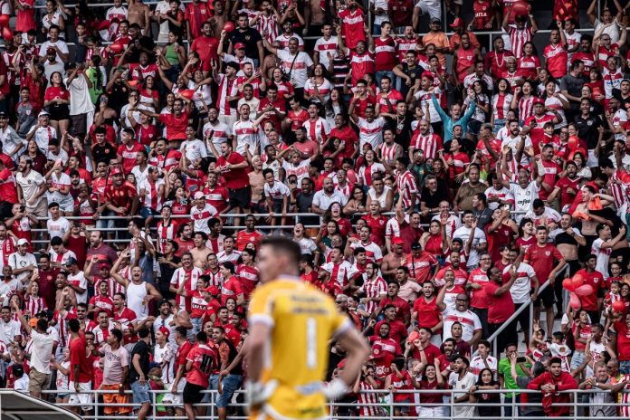Torcida do CRB comemora gol de Anselmo Ramon, o único na vitória sobre o Fortaleza em Maceió
