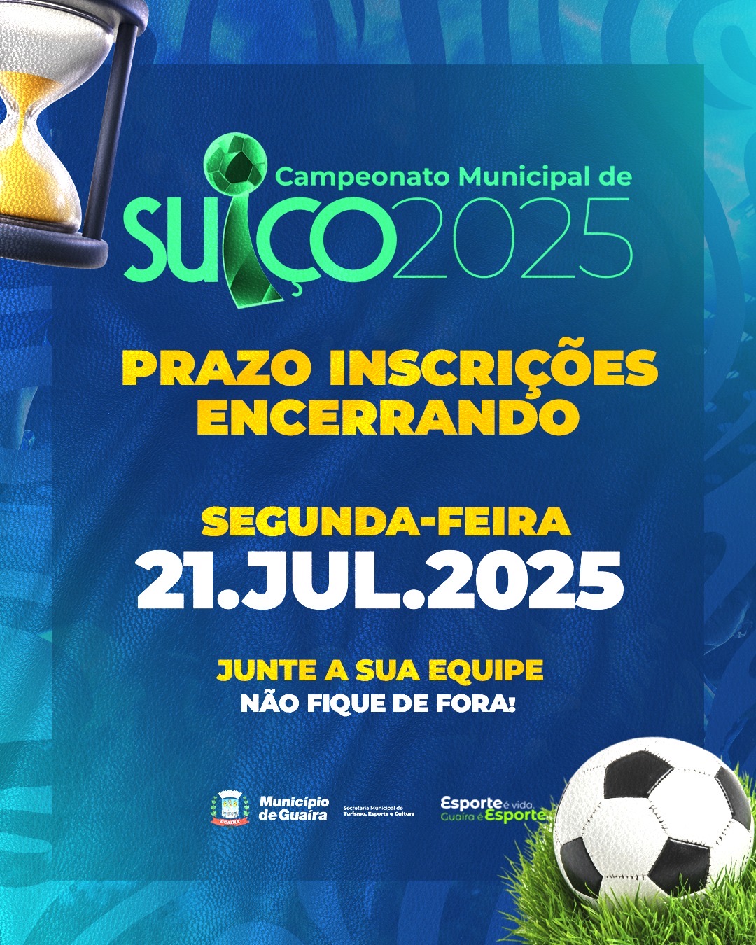 O Município de Guaíra, por intermédio da Diretoria de Esportes da Secretaria de Turismo, Esporte e Cultura (SEMTEC), alerta os desportistas locais: as inscrições para o Campeonato Municipal de Futebol Suíço 2025 se encerram na próxima segunda-feira, dia 21 de julho. O aviso reforça a reta final de um dos momentos mais aguardados do calendário esportivo municipal.