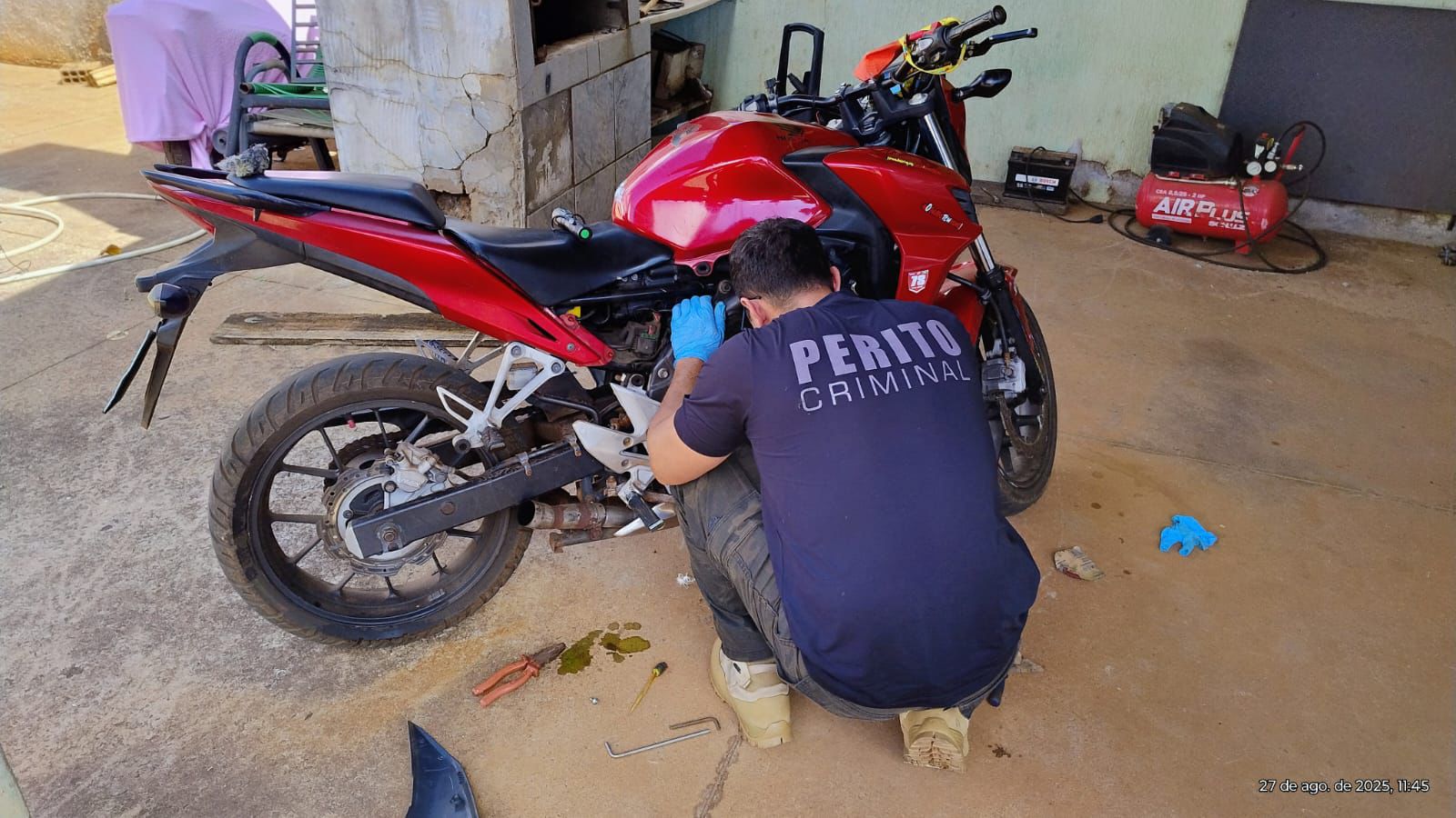 Ainda na mesma residência, os agentes encontraram uma motocicleta Honda CB 500, também com sinais de adulteração e placa falsa, confirmando tratar-se de um veículo roubado em 2024, no município de Jaguariúna-SP.