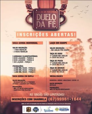 Com apoio da prefeitura de Iguatemi e da câmara de vereadores, Iguatemi será sede do 2º Duelo da Fé, do Laço Comprido, do dia 28 ao dia 30 de novembro de 2025, na Fazenda Tuneiras, Pista: Vicente Gatti Palla Rossi, Km 6 da Rodovia 295, entre Iguatemi e Eldorado -MS. A organização da competição, espera contar com a participação de laçadores da região de todo o estado de Mato Grosso do Sul., Paraná e até mesmo do País vizinho, Paraguai.