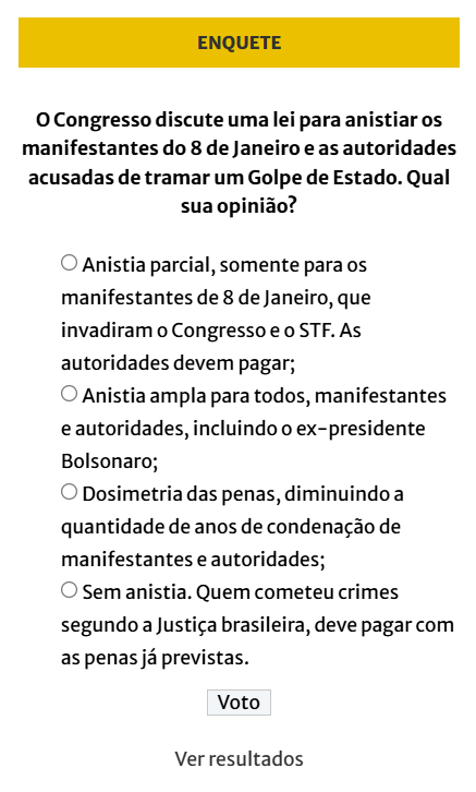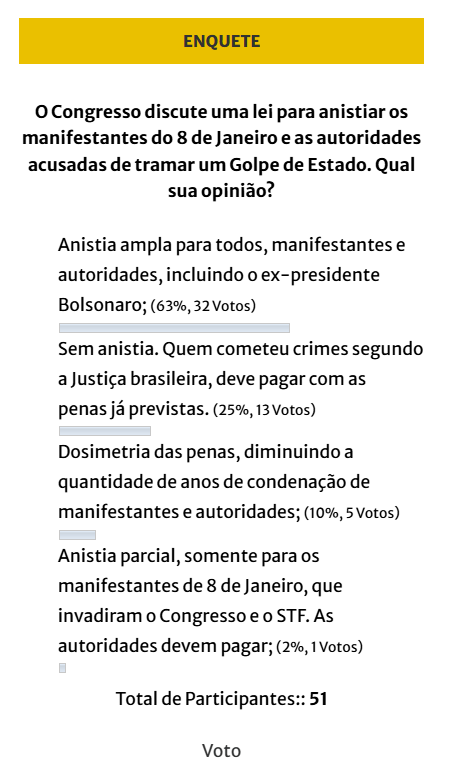 Tema espinhoso e polêmico, a enquete ainda dá opção da escola da opção de Dosimetria e o abrandamento de penas para os envolvidos ou a opção de anistia parcial, somente para os manifestantes. O resultado parcial era de anistia ampla em primeiro e sem anistia em segundo, com as outras duas opções pouco escolhidas.