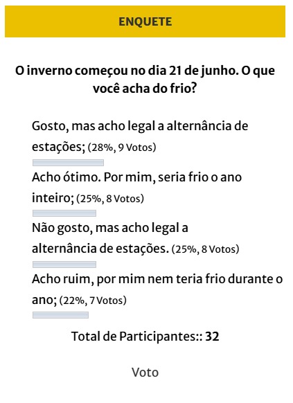 A enquete anterior, que ficou na página durante o inverno, teve muito equilíbrio no seu resultado final. Em primeiro (28%) ficou a opção de quem gosta do frio, mas acha legal a alternância de estações.
