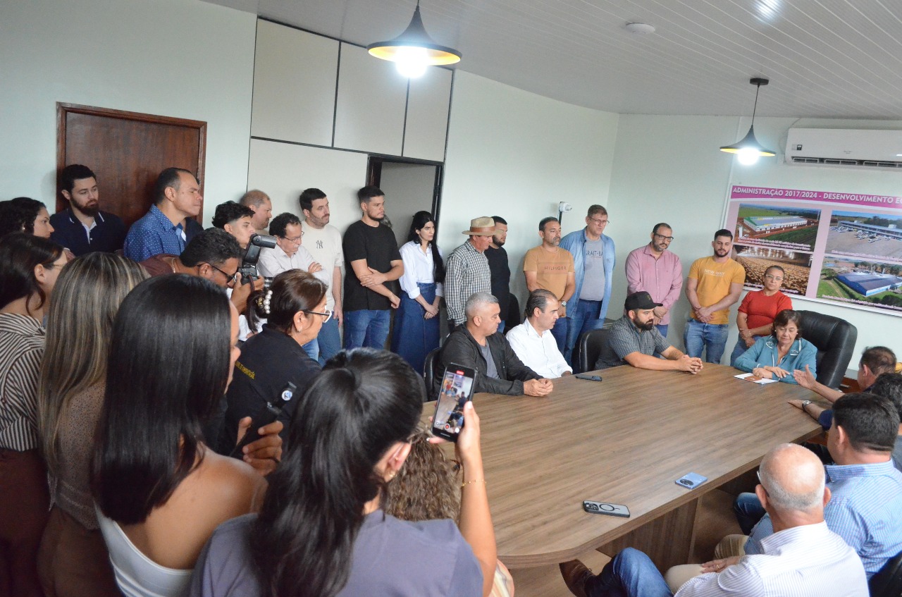 Sala de reuniões da prefeitura esteve lotada, com autoridades, servidores e imprensa (foto: Jandaia Caetano/Tv Sobrinho)