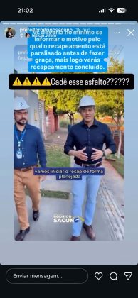 “VC deveria no mínimo se informar o motivo pelo qual o recapeamento está paralisado antes de fazer graça, mas logo verás o recapeamento concluído”.