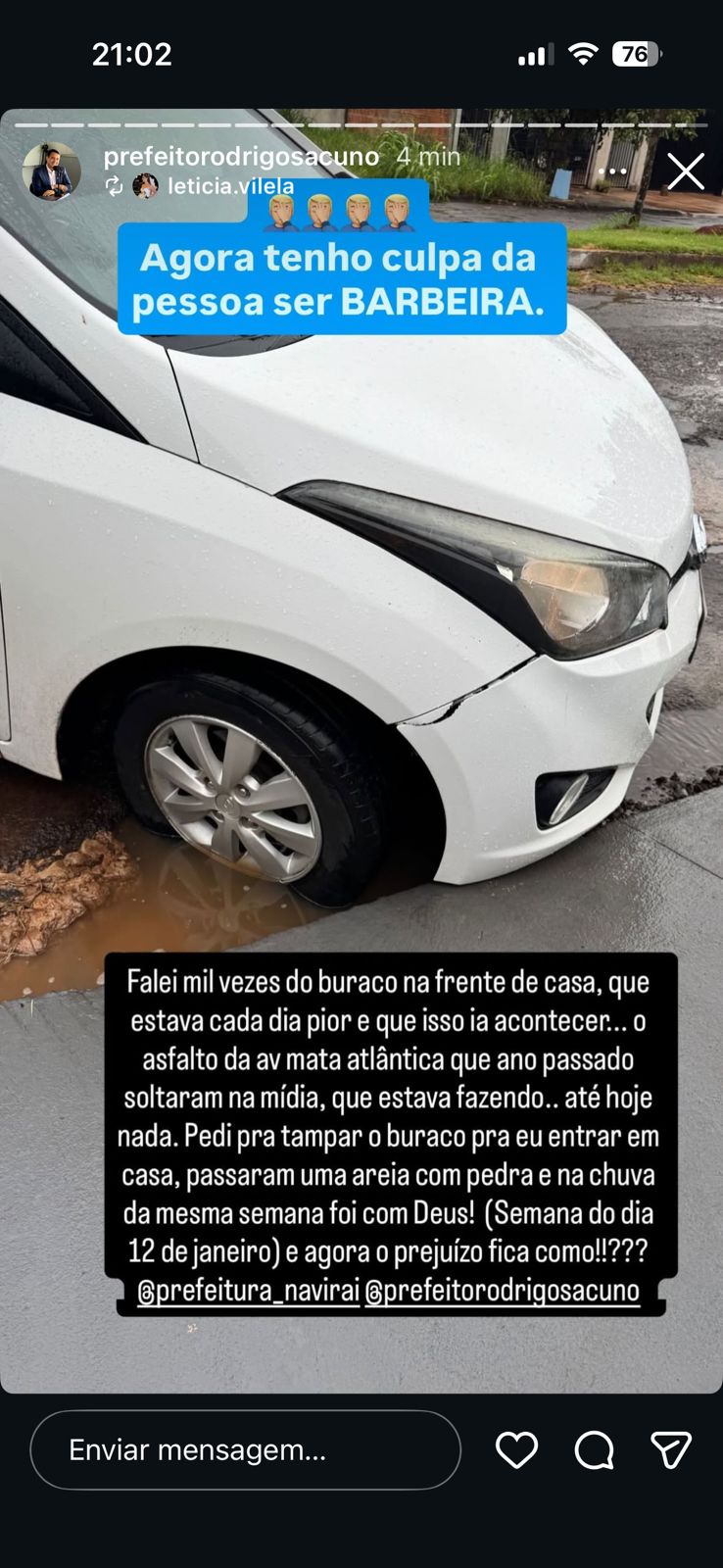 Na última sexta-feira (13), uma moradora sofreu um acidente com seu veículo ao tentar entrar em sua residência, localizada na Avenida Mata Atlântica, em Naviraí. O local teve o seu recapeamento anunciado pelo prefeito Rodrigo Sacuno (PL) no ano passado, mas a obra está paralisada.