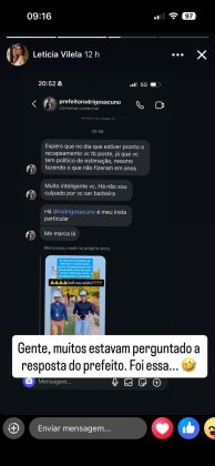 Ela fez postagem na rede social e foi repreendida pelo prefeito, que retrucou em um story no seu Instagram: