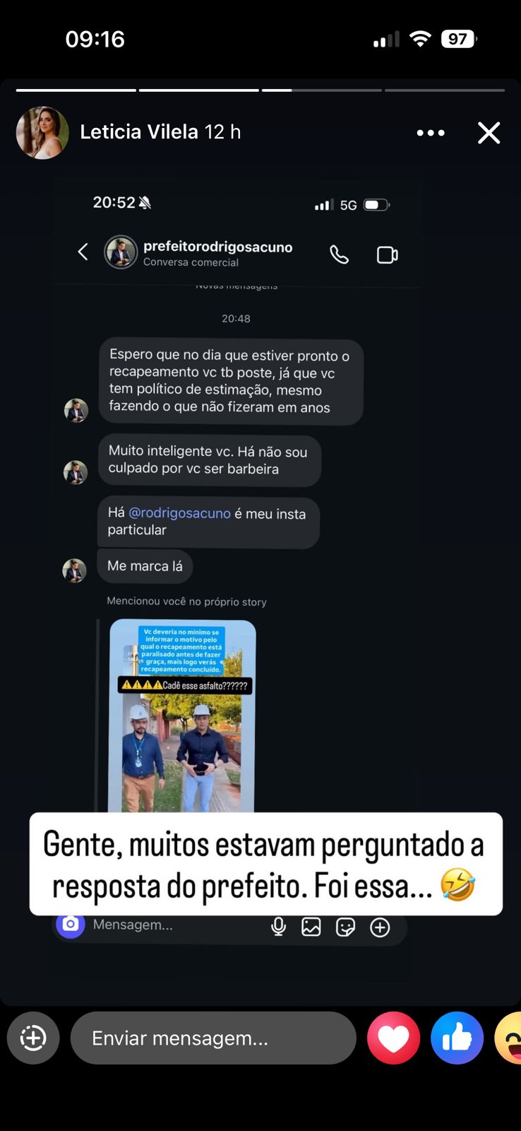 A cidadã ainda publicou conversa com o prefeito pelo Instagram em que o mandatário a acusou de ter “politico de estimação” e ainda reforçou: “Há não sou culpado por vc (sic) ser barbeira”.