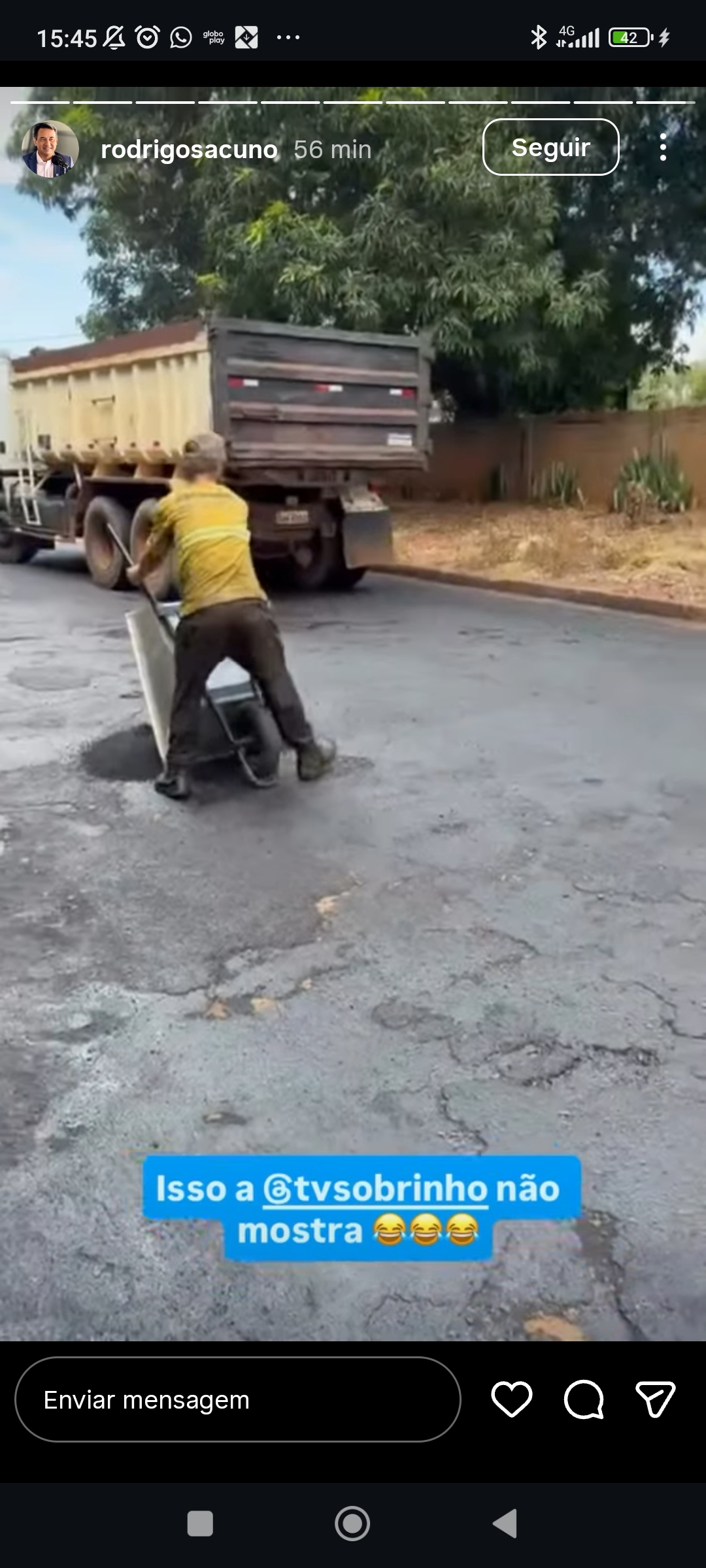 Ao mostrar obra de recapeamento nesta segunda-feira, o prefeito citou: “Isso a @tvsobrinho não mostra”. A emissora republicou o story em que foi marcada por Sacuno.