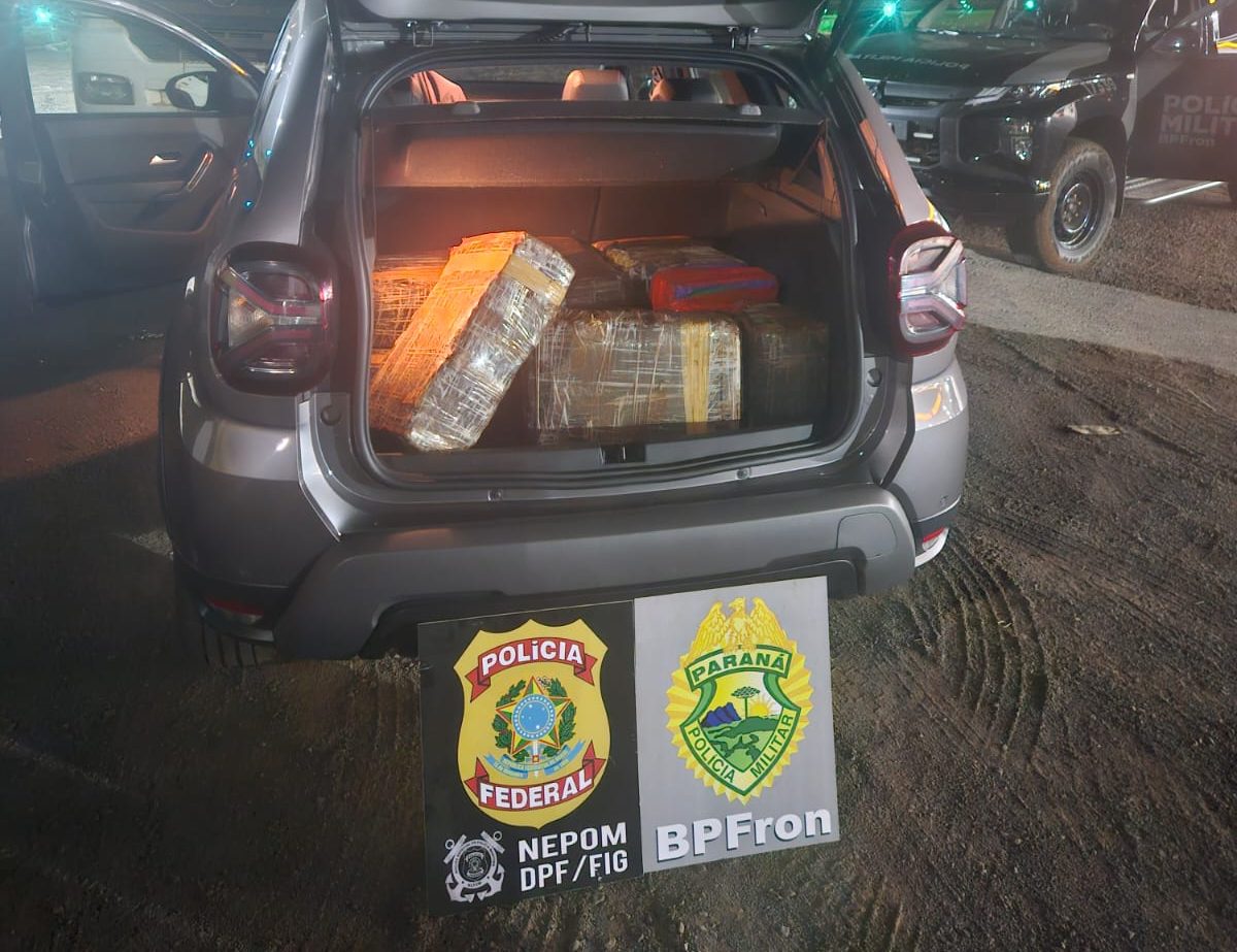 Após buscas continuadas, as equipes lograram êxito em localizar e abordar dois veículos, sendo um Chevrolet Onix (utilizado como “batedor”) e um Renault Duster (utilizado para o transporte da carga ilícita). Durante a revista no veículo Renault Duster, foram encontrados 11 volumes que totalizaram 201 kg (duzentos e um) quilos de substância análoga à maconha.
