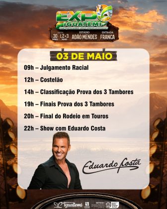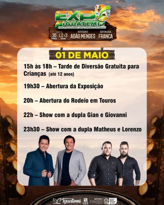 A Expo Iguatemi vai até domingo, 3 de maio. São quatro dias de festa em comemoração ao aniversário de 61 anos do município, com shows, rodeio em touros, prova dos três tambores, praça de alimentação e parque de diversões. A entrada é gratuita todos os dias.