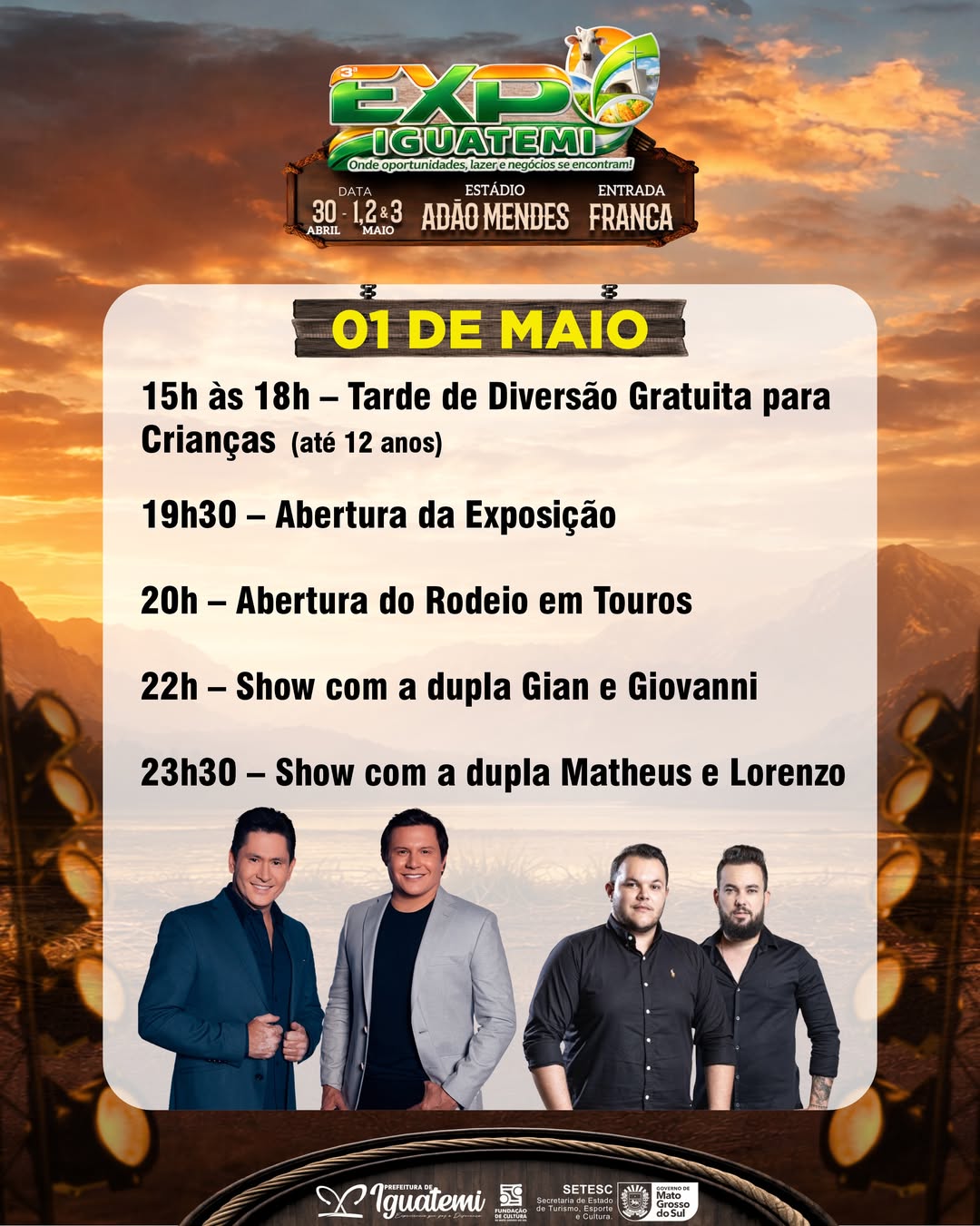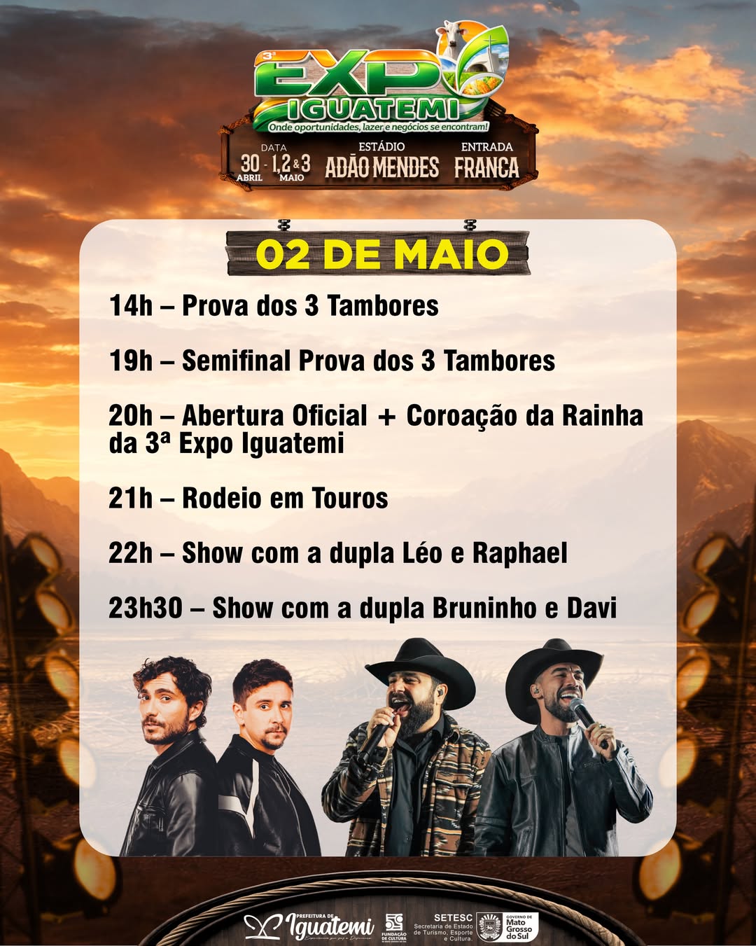 A Expo Iguatemi 2026 começa nesta quinta-feira (30). A festa abre com a Marcha para Jesus às 19h no Posto Shalon. Às 21h, tem show com a dupla gospel André e Felipe no Estádio Adão Mendes.